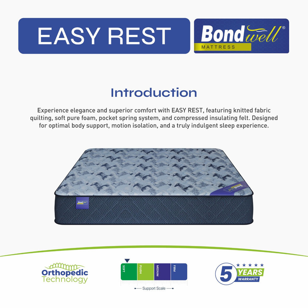 Experience elegance and superior comfort with EASY REST , featuring knitted fabric quilting, soft pure foam, pocket spring system, and compressed insulating felt. Designed for optimal body support, motion isolation, and a truly indulgent sleep experience.